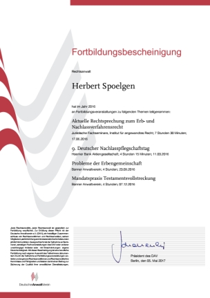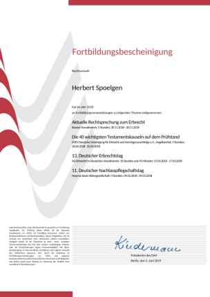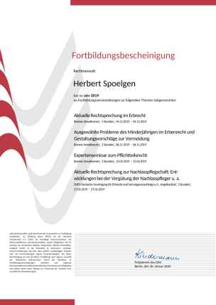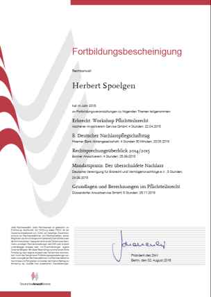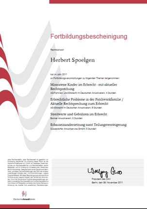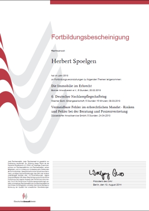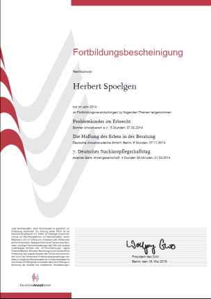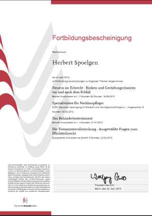 Februar 2020: Fortbildungsbescheinigung des Deutschen Anwaltvereins für 2019 Juni 2019: Fortbildungsbescheinigung des Deutschen Anwaltvereins für 2018 März 2018: Fortbildungsbescheinigung des Deutschen Anwaltvereins für 2017 Mai 2017: Fortbildungsbescheinigung des Deutschen Anwaltvereins für 2016 August 2016: Fortbildungsbescheinigung des Deutschen Anwaltvereins für 2015 Mai 2015: Fortbildungsbescheinigung des Deutschen Anwaltvereins für 2014 August 2014: Fortbildungsbescheinigung des Deutschen Anwaltvereins für 2013 Juli 2012: Fortbildungsbescheinigung des Deutschen Anwaltvereins für 2012 November 2011: