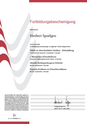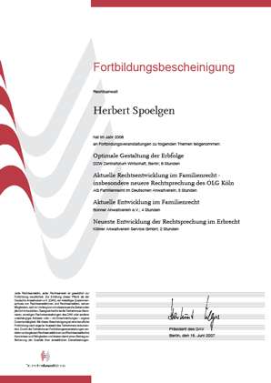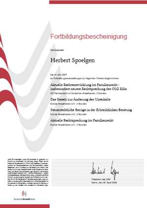 des Deutschen Anwaltvereins für 2011 April 2010: Fortbildungsbescheinigung des Deutschen Anwaltvereins für 2009 März 2009: Fortbildungsbescheinigung des Deutschen Anwaltvereins für 2008 April 2008: Fortbildungsbescheinigung des Deutschen Anwaltvereins für 2007 Juli 2007: Fortbildungsbescheinigung des Deutschen Anwaltvereins für 2006